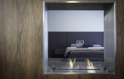 Eklektická pohovka zhotovená na míru pro tento prostor kombinuje několik zdánlivě nesourodých vzorů a textur. Sedáky lze oddělit od opěráků a slouží jako velkorysé spaní pro hosty. Do stěny mezi ložnicí a obývacím prostorem je osazen oboustranný lihový krb. Koupelna a toalety je oddělena stěnou z drátěného skla. Všechny dveře v bytě jsou posuvné, až do stropu.