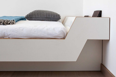 An awesome desk with a metal construction, bed with an integrated bookshelf. Immaculate taste can be honed from an early childhood, for example by getting used to these colour-contrasting recessed handles.