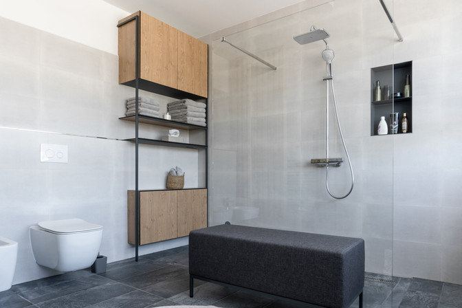 Zlatá je i skříňka v hlavní koupelně. V původním projektu měla být v koupelně vana, které jsme se "zbavili" a vznikl tak velkorysý a přehledný prostor. Také pračku a sušičku jsme přesunuli do skříně sousedního hostinského pokoje.