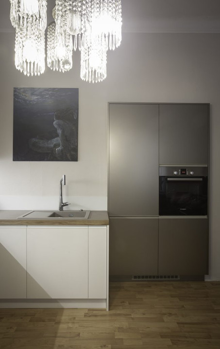 Matný zlatý lak, pracovní deska z ultra matného laminátu, na kterém nejsou vidět šmouhy a otisky prstů, hrana z masivního dubu, účinná digestoř BORA.
