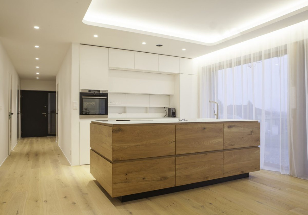 OAK AND WHITE IIKlára Nováková1. 2. 2021Minut čtení: 1A cooktop with efficient Bora extractor and a sink are located on the robust island.The natural veneer from old oak wood contrasts nicely with the matt white lacquer.
